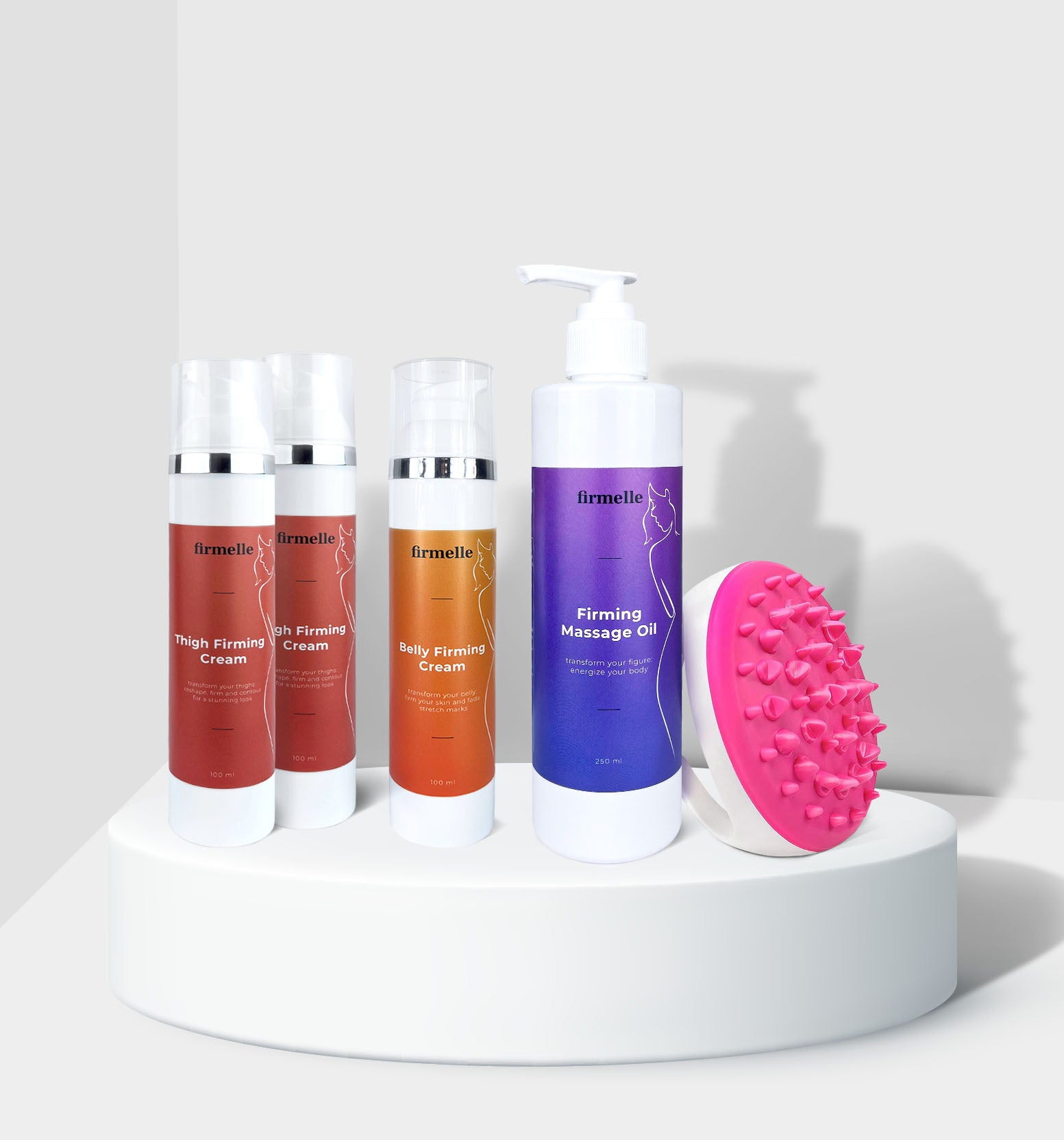 - 2 Crema rassodante per le cosce - 1 Crema rassodante per la pancia - 1 Olio per massaggi contro la cellulite - 1 Massaggiatore antirughe